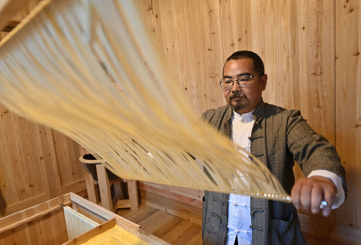 11月4日,在巴阳杠子面生产工厂,巴阳杠子面传统制作技艺传承人刘益在展示巴阳杠子面的制作技艺。新华社记者 肖潇 摄