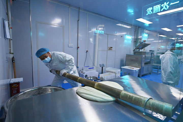 11月4日,在巴阳杠子面生产工厂,工作人员在用杠子压面。新华社记者 肖潇 摄